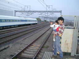 新幹線を見た優希は大はしゃぎ。でも実は通り過ぎるひかりの音がものすごく大きいから,ちょっと後ずさり気味の優希。