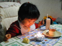 1月25日。自宅でも誕生会をしました。ろうそくを吹き消しては,手をたたいて喜んでいました。