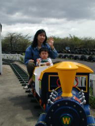 SLに引かれる乗り物には,エルも一緒に乗れました。おもちゃのようなSLでも優希にとってはりっぱな本物の蒸気機関車。