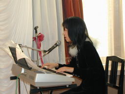 そして,披露宴も後半にさしかかり,ママの余興です。この時のために,1ヶ月(ライブ終わってからほとんど毎日)練習してきたの。でも,,,やっぱり心配通り,すっごく緊張!前に少ししゃべったんだけど,それも手がふるえちゃうし,声も震えちゃうし,演奏もかなり間違えちゃった。ごめんねー。